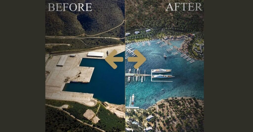 Μιλάμε για ολική μεταμόρφωση 1.778 στρεμμάτων. Στο τελικό στάδιο ανάπτυξης, η νέα μαρίνα θα διαθέτει άνω των 350 θέσεων ελλιμενισμού εκ των οποίων 105 για σκάφη άνω των 40 μέτρων. Παράλληλα, θα αναπτυχθούν ξενοδοχεία 5 αστέρων συνολικής δυναμικότητας 565 δωματίων, πολυτελείς κατοικίες, χώροι γραφείων, εστίασης, ψυχαγωγίας, αθλητισμού και συνεδρίων.
